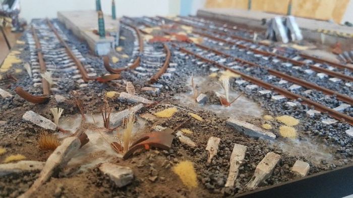 Une fois toutes ces étapes franchies, il ne restait « plus » qu’un travail assez classique à produire : ajouter des zones de terre et de sable, des petits éléments métalliques pour accentuer l’effet abandonné, courber les rails (au sèche-cheveux) au niveau du cratère, ajouter des petit éléments essentiels : éclairage des quais (lampadaires « bric-à-brac » constitués d’une cheville, un pic en bambou, un bout de capuchon de stylo bic, un clou à tête bombé et une sphère modelée), des butées de fin de voie au niveau de la zone de chargement, et pour finir un panneau « Gsaadt » en l’honneur d’un copain et d’une de ses blagues récurrentes :